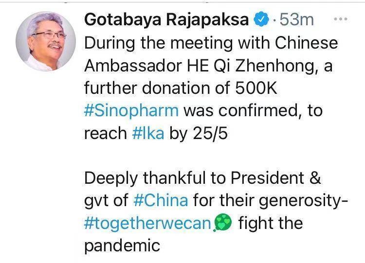 “在和中國(guó)(駐斯里蘭卡)大使戚振宏會(huì)面期間,一項(xiàng)50萬(wàn)劑中國(guó)國(guó)藥疫苗的進(jìn)一步捐贈(zèng)(計(jì)劃)被確認(rèn),”拉賈帕克薩在推文中寫道,“深深地感謝中國(guó)政府和領(lǐng)導(dǎo)人的慷慨,讓我們一起抗擊疫情。”推文下面,拉賈帕克薩還附上了與戚振宏大使的合照。