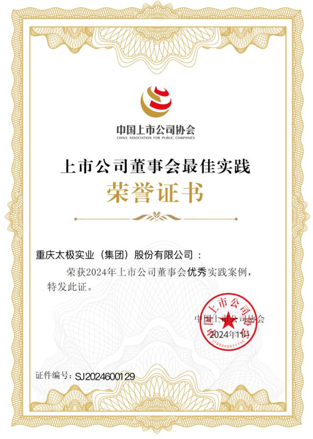 近日,由中國上市公司協(xié)會(huì)舉辦的“上市公司董事會(huì)最佳實(shí)踐案例征集活動(dòng)”獲獎(jiǎng)名單正式揭曉,太極集團(tuán)憑借規(guī)范有效的董事會(huì)運(yùn)作,先進(jìn)的治理模式,科學(xué)的治理效能,榮獲“2024年上市公司董事會(huì)優(yōu)秀實(shí)踐案例”。